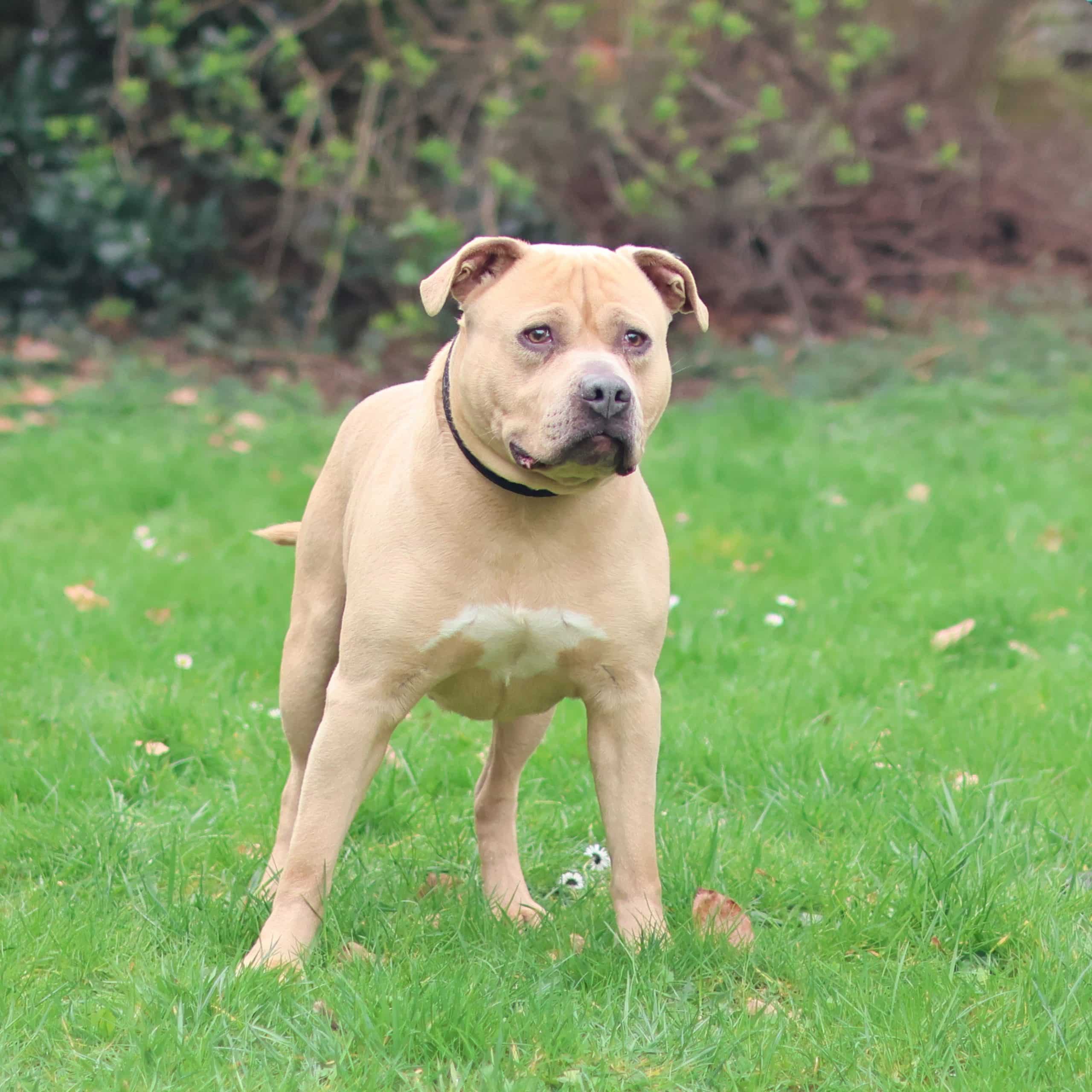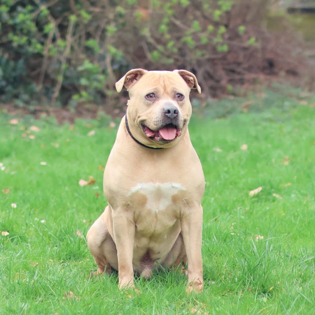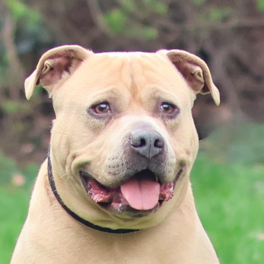 Deze sterke brok is Kenzo. Kenzo is een Staffordshire Terriër reu, geboren in september 2018. Hij kwam bij ons terecht na een inbeslagname en is nu vrij voor adoptie!