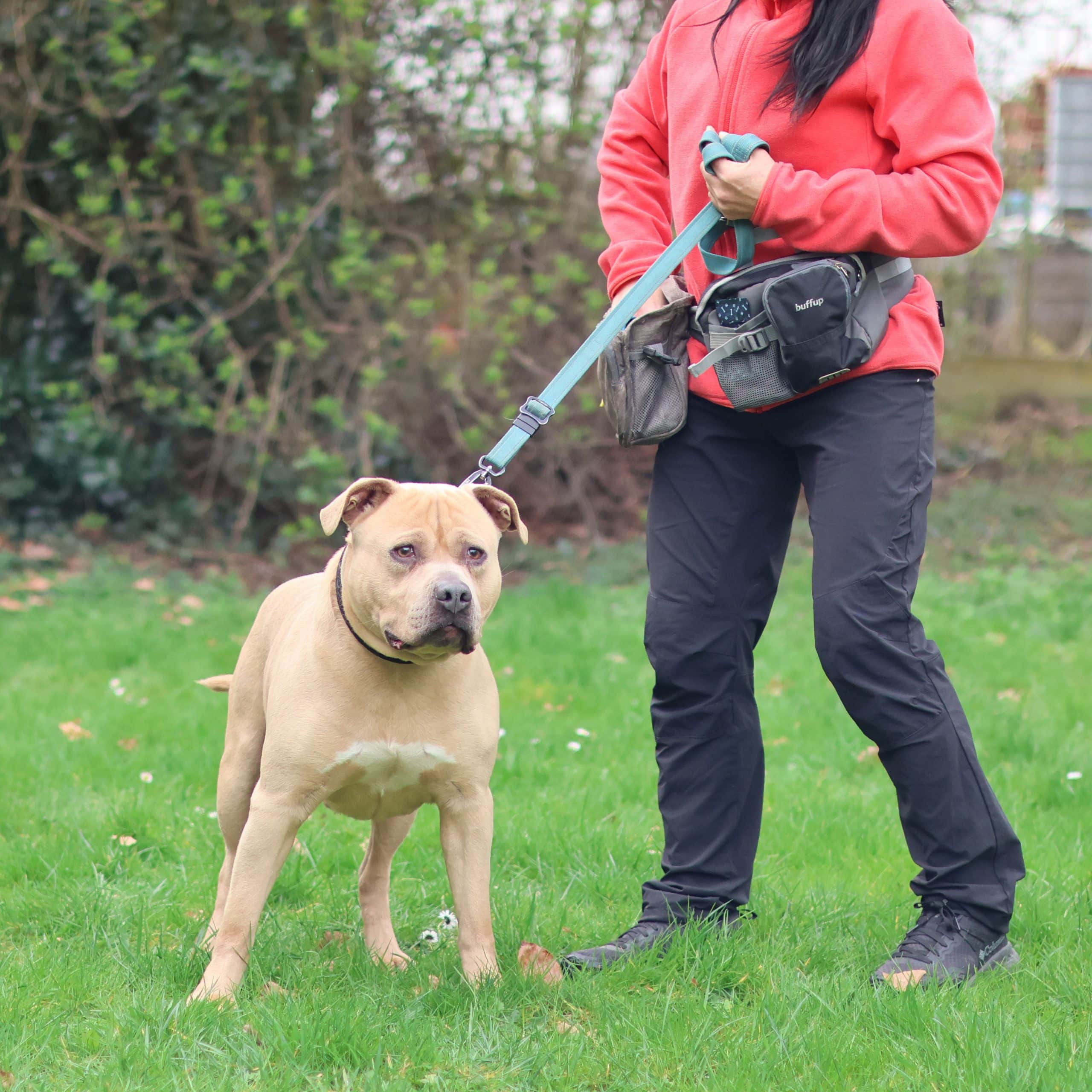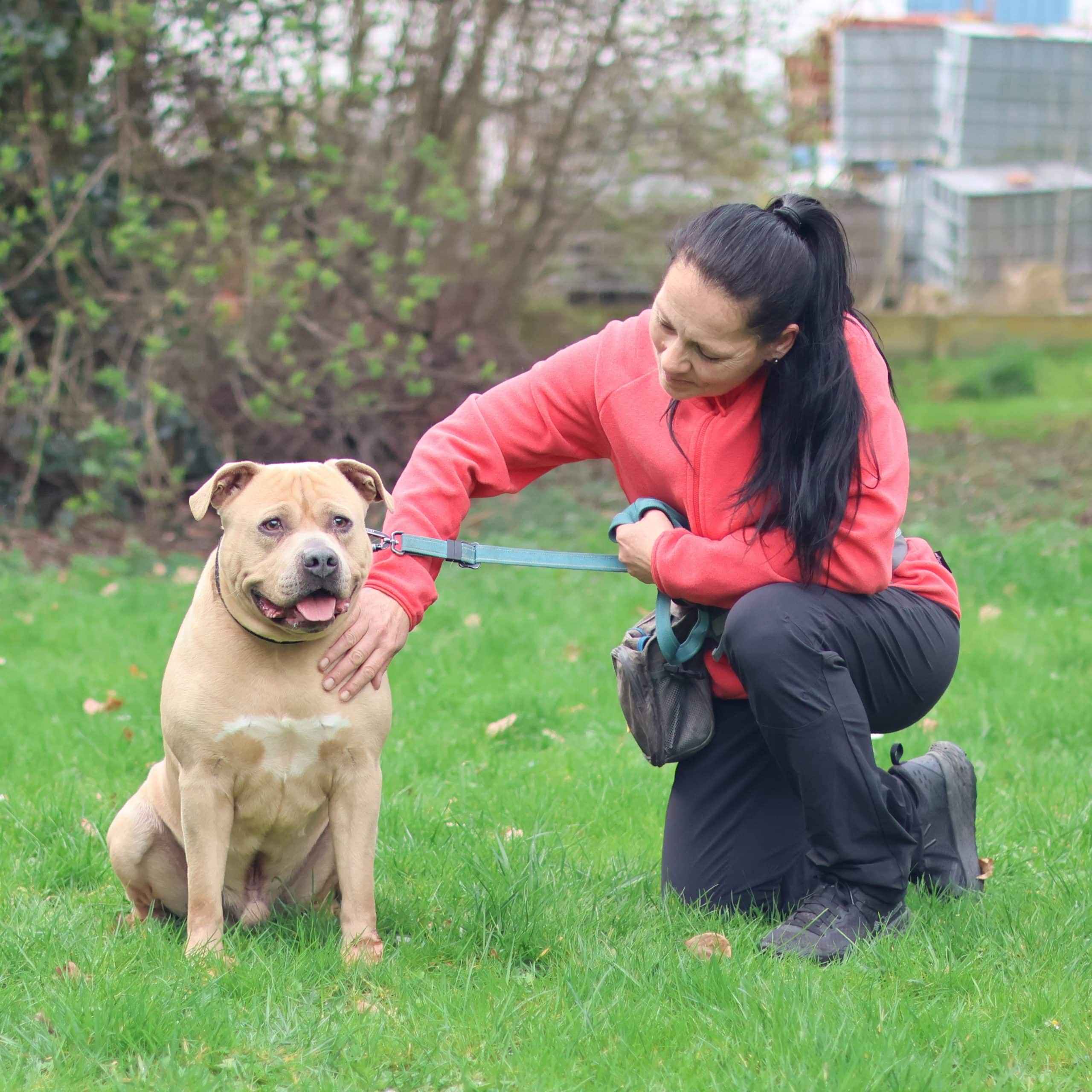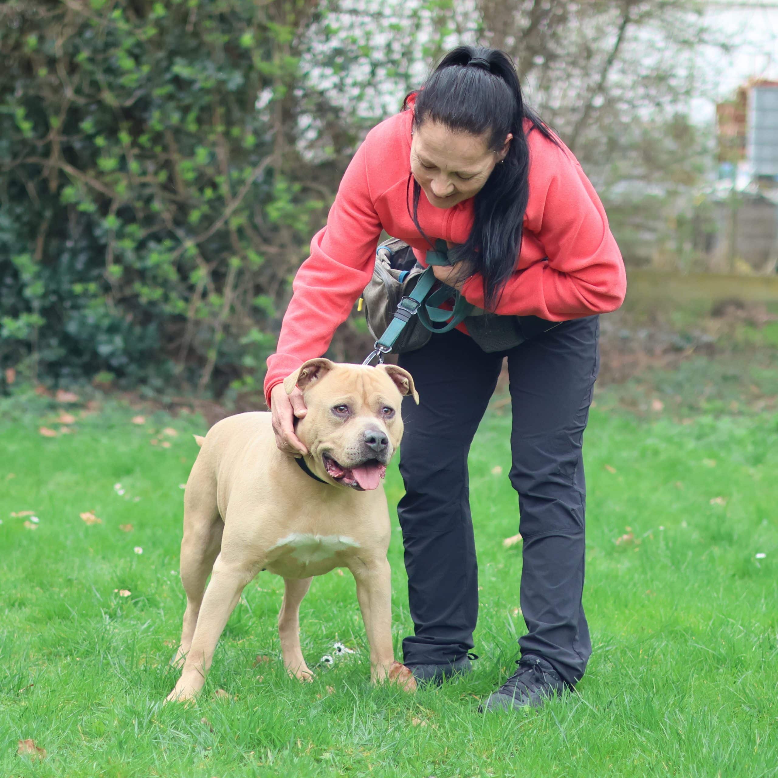 Deze sterke brok is Kenzo. Kenzo is een Staffordshire Terriër reu, geboren in september 2018. Hij kwam bij ons terecht na een inbeslagname en is nu vrij voor adoptie!