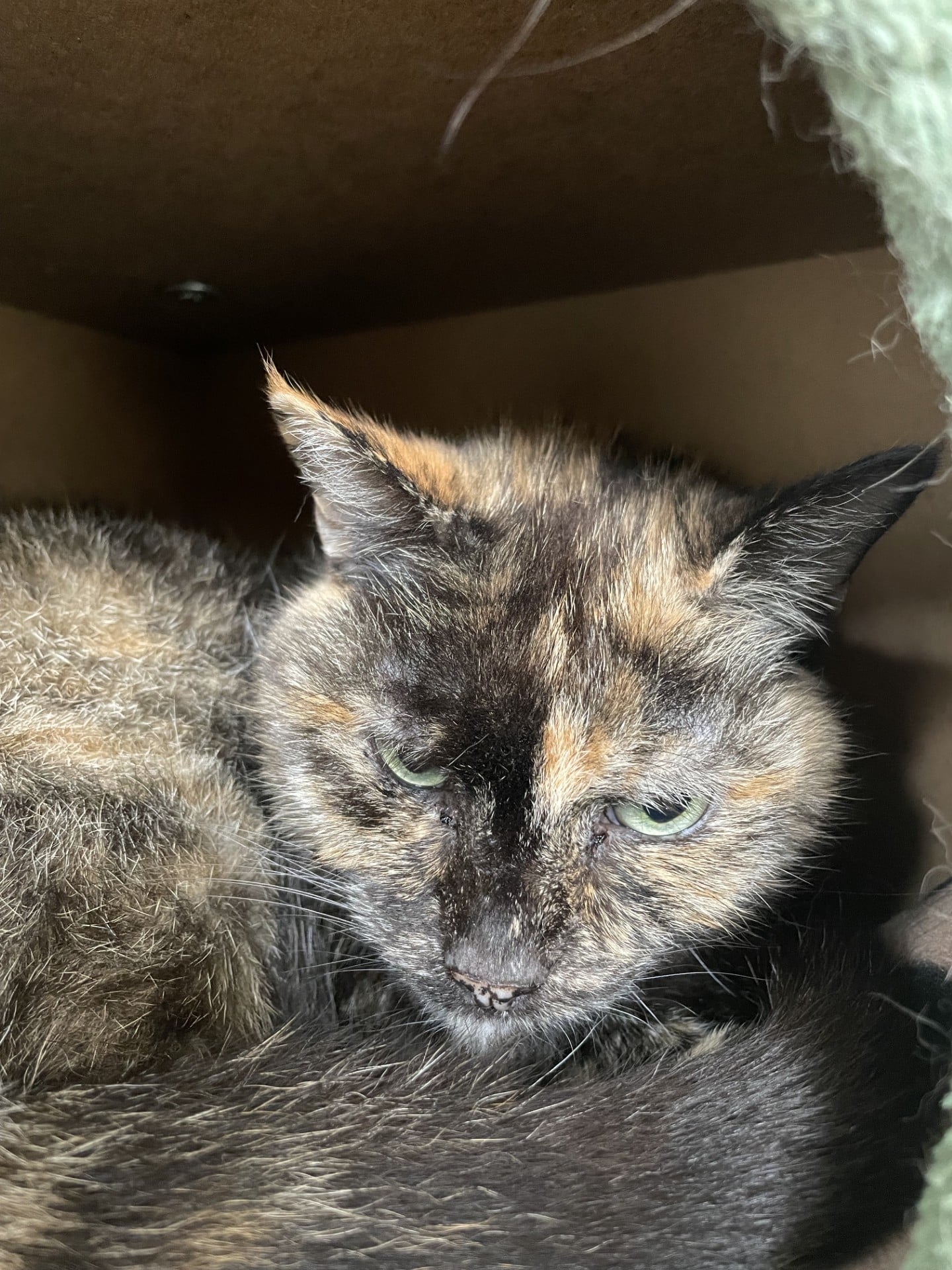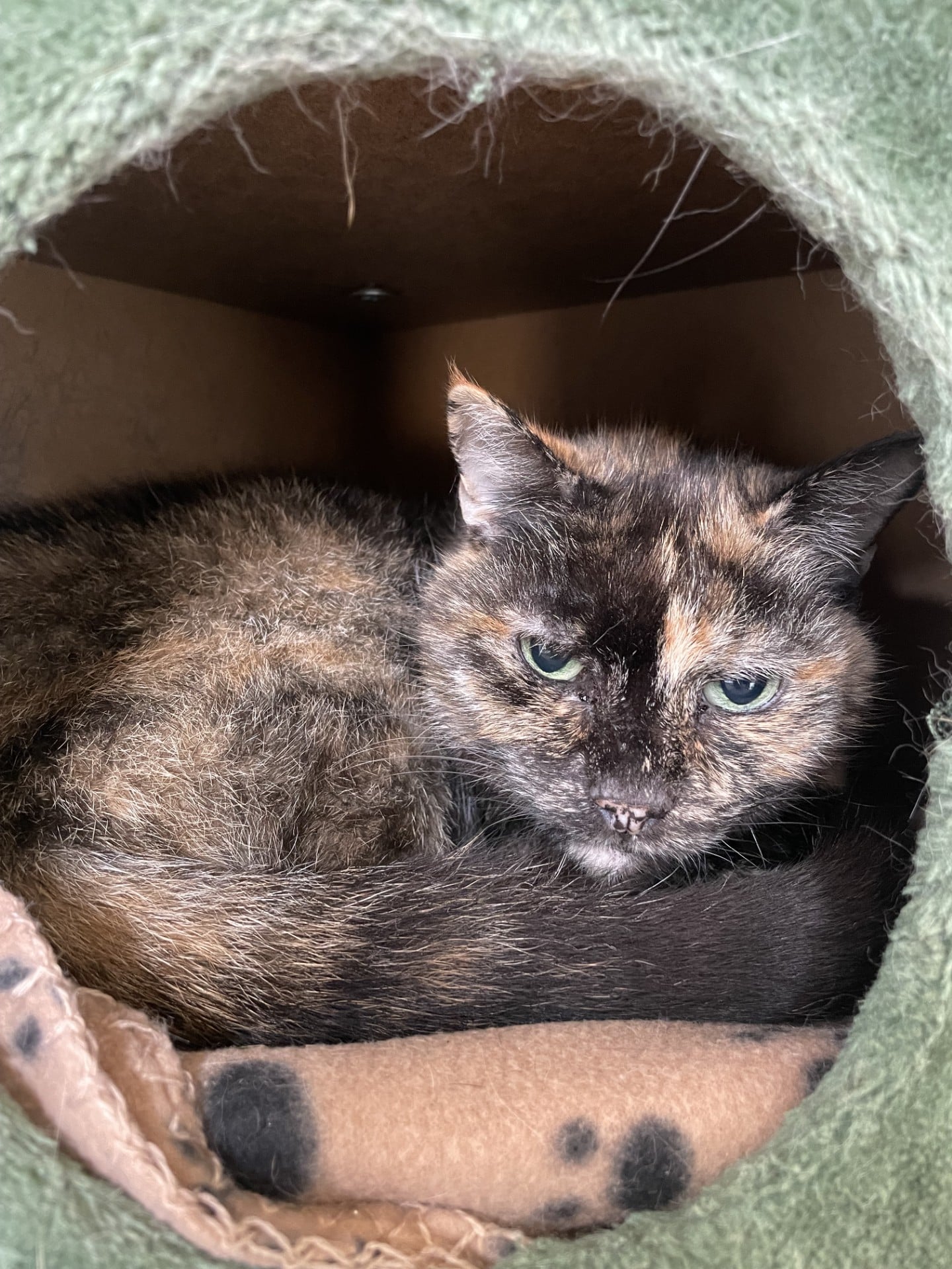 Nym is een oudere kat die wat tijd nodig heeft om zich aan te passen, zich op haar gemak te voelen en zich open te stellen. Ze voelt zich het best in een rustige omgeving waar ze de ruimte en tijd krijgt die ze nodig heeft.