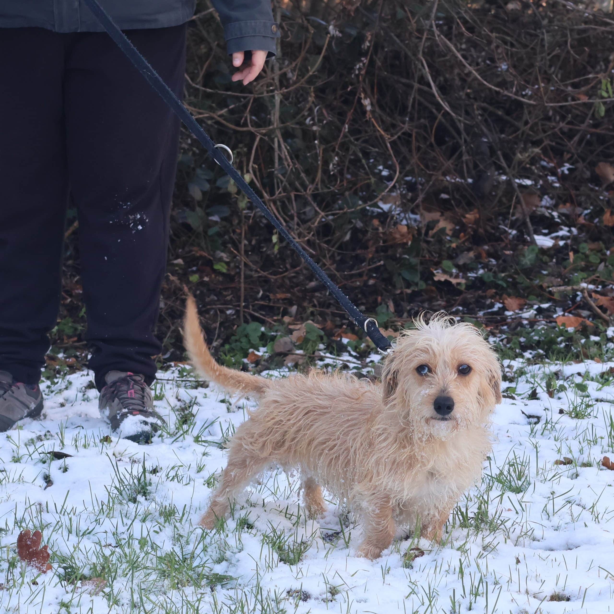 Hij is wat bang en timide. Dit is wel al erg verbeterd en dit zal zeker nog verbeteren in een goede thuisomgeving. Hij kan heel goed overeenkomen met andere honden maar kan buitenshuis en aan de lijn reactief zijn naar honden. Dit is puur door zijn onzekerheid. Dit is zijn werkpuntje. Verder wandelt hij wel fijn aan de lijn. Dit wanneer hij in het gezelschap is van een andere hond. Er lijkt wat terriĆ«r in z’n genen te zitten dus we vermoeden dat hij zeker nog zal loskomen en energiek zal zijn eens hij zich thuis voelt!