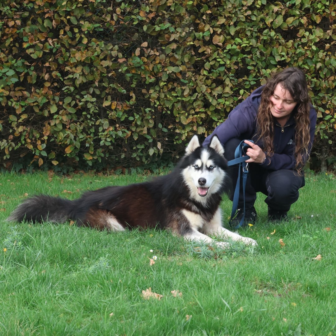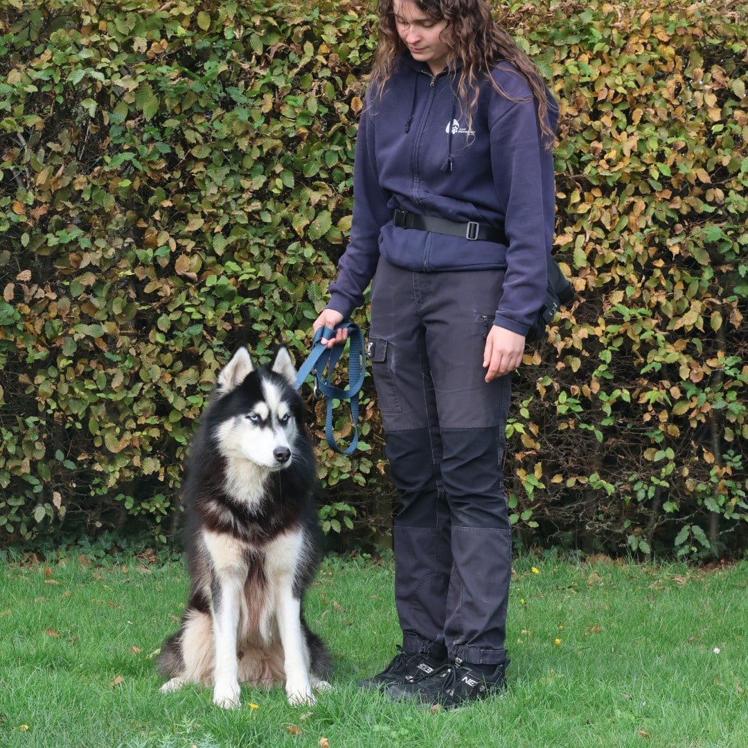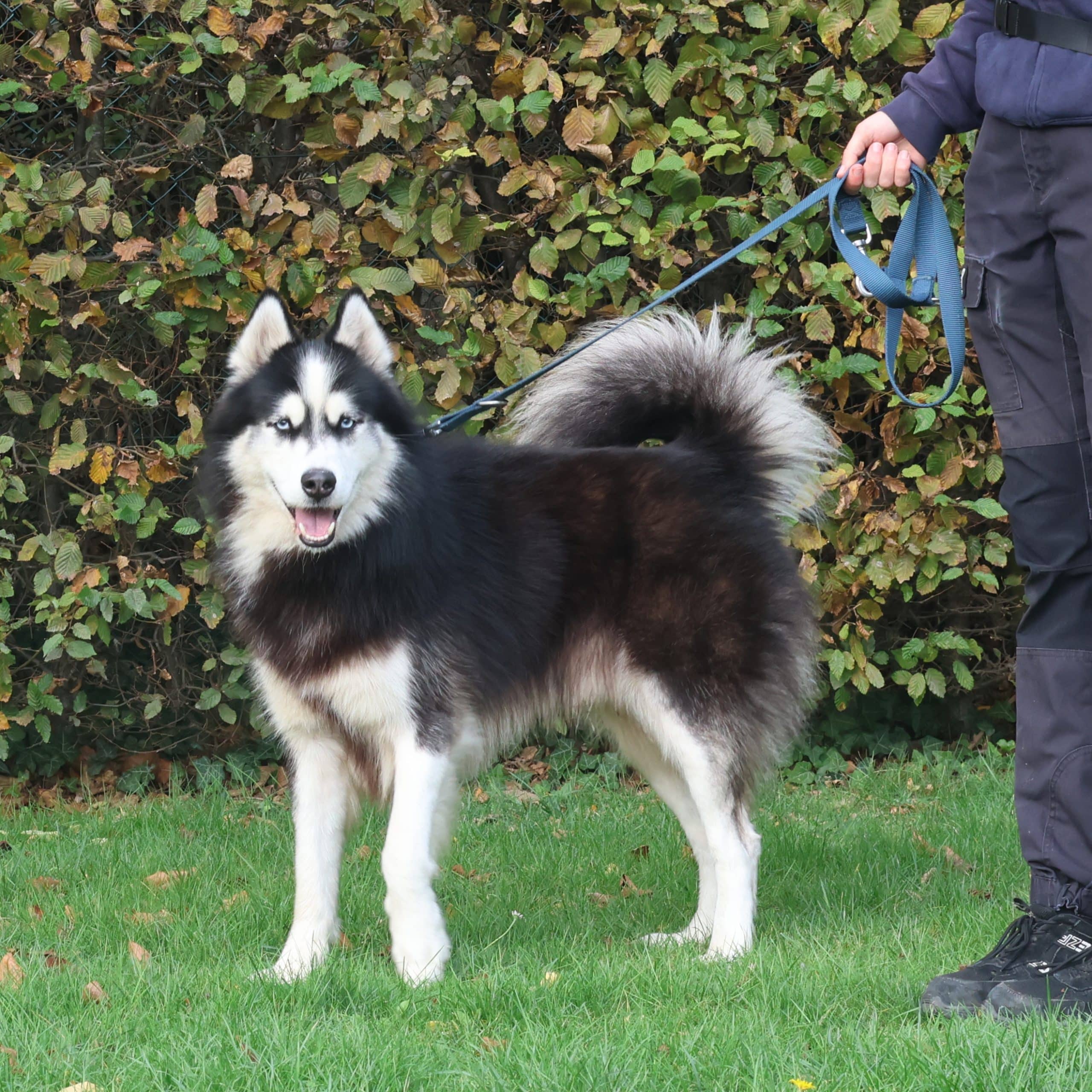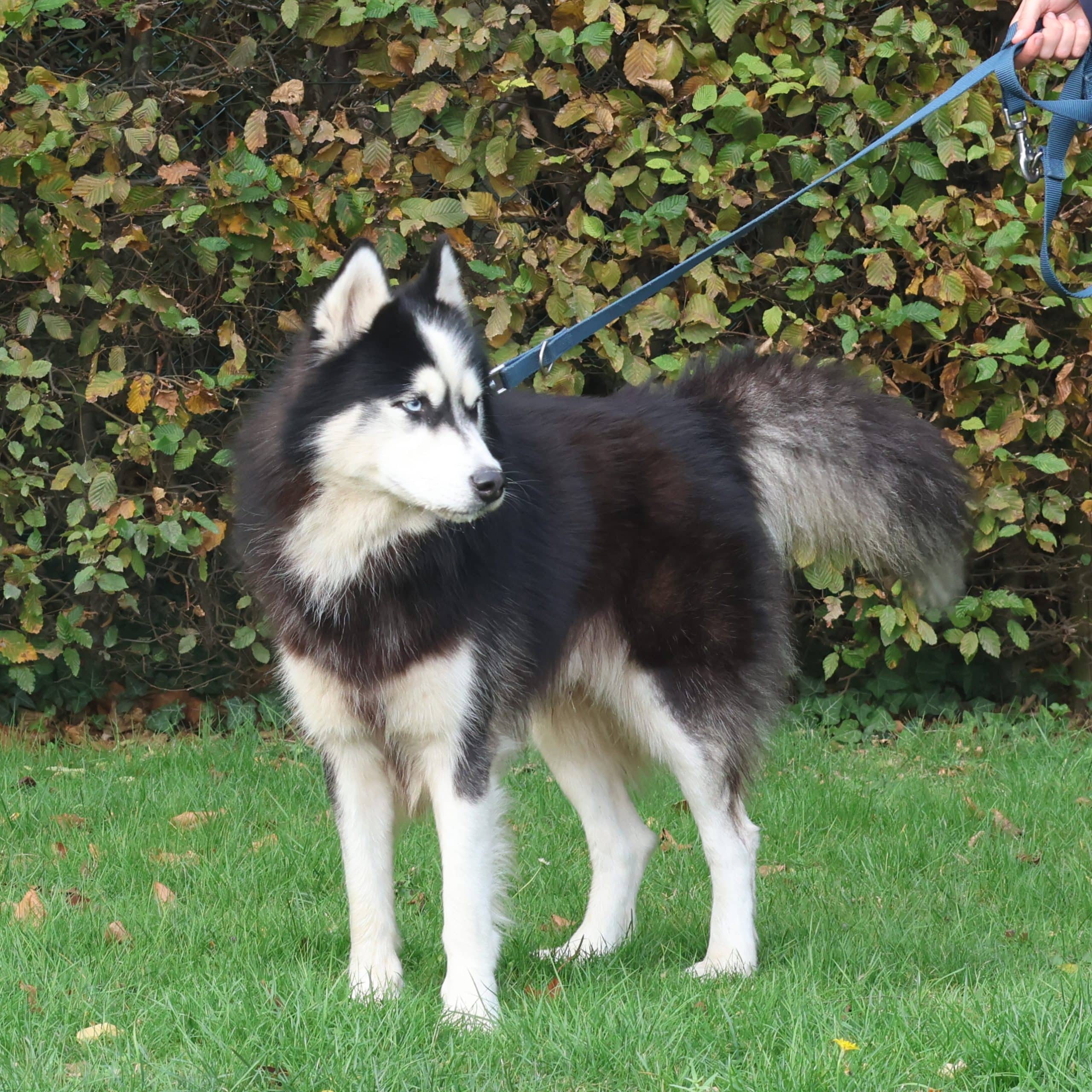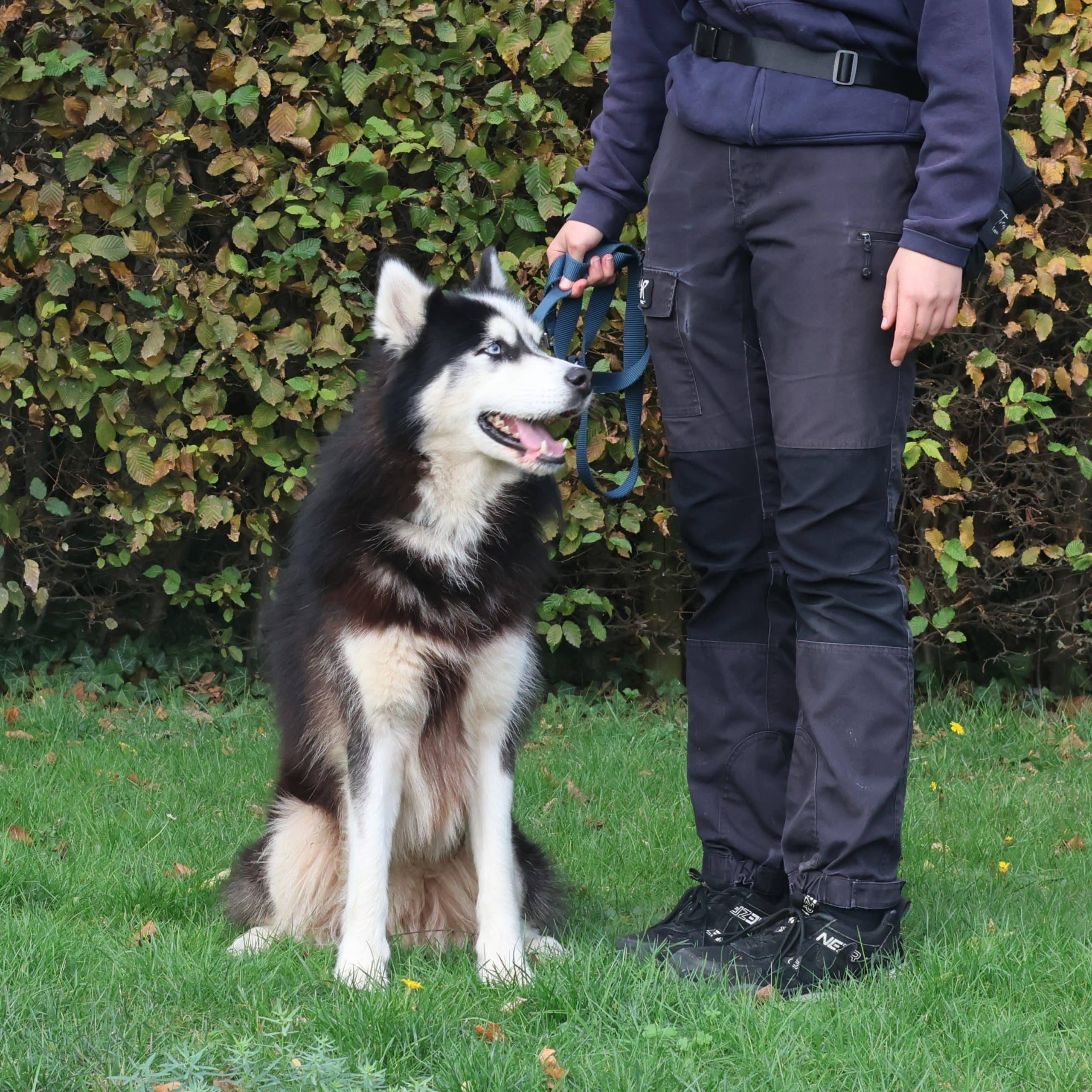 Alpha is een typische husky. Z’n oren staan vaak uit en hij doet zo wat z’n dingetje. Uiteindelijk komt hij wel naar je toe en houdt hij ook wel van een fijne kroelbeurt. Hij leefde mee in huis en kon hier volgens de eigenaar goed alleen blijven. Dit moet volgens ons wel wat terug opgebouwd worden. In de huiselijke omgeving reageert hij ook wel goed.