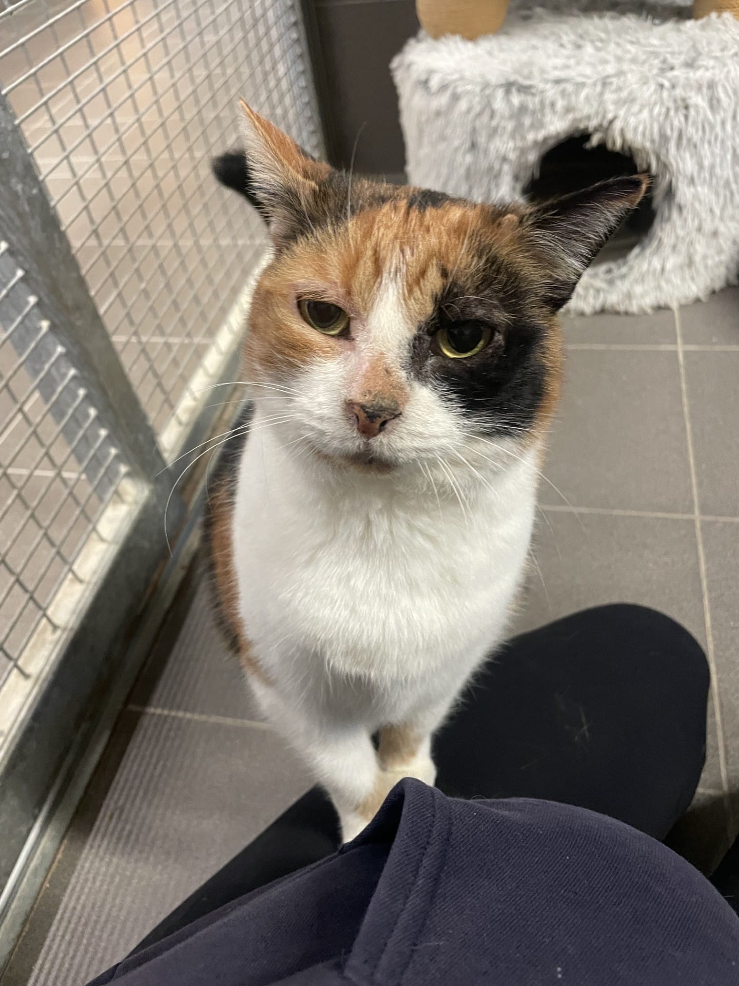 Trees is een oudere kat, maar nog steeds actief en in goede gezondheid, al zou ze een paar kilo kunnen verliezen. Ze heeft wat tijd nodig om te wennen, maar voelt zich snel op haar gemak bij mensen en vraagt dan heel intens om aandacht en knuffels. Hoewel ze graag contact heeft met mensen, accepteert ze het niet om opgepakt te worden, en laat ze duidelijk merken wanneer ze zich ongemakkelijk voelt.